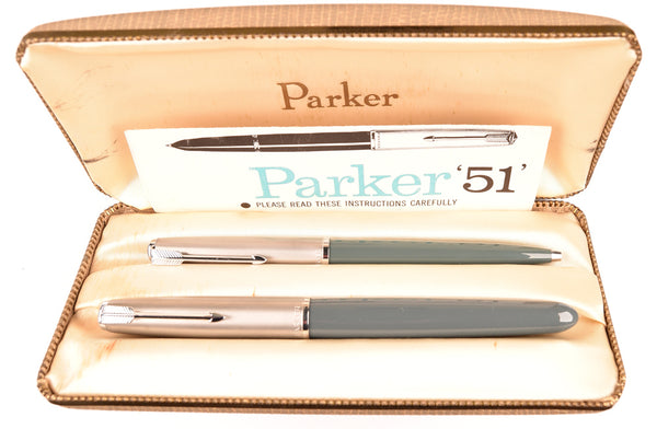 This is a boxed set of English Parker 51 Mk1 Classic fountain pen and ballpoint in grey with steel caps. The pen's fitted with a medium 14k gold nib which produces a writing line of around 0.6mm