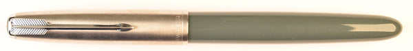 This is a boxed English Parker 51 Mk1 Classic fountain pen and pencil set in grey with a steel cap. The pen's fitted with a medium 14k gold nib which produces a writing line of around 0.6mm