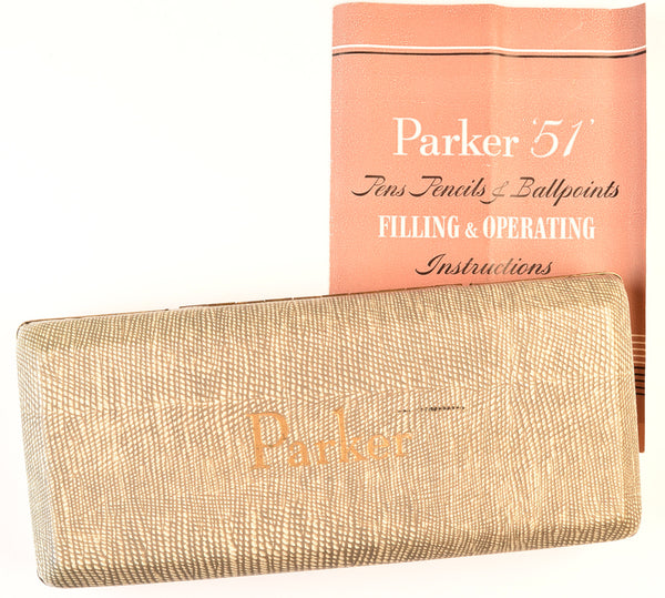 The set comes with the hardshell Parker box and instruction leaflet shown in the photos.  This design of this box is one used by Parker in the 1950s