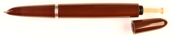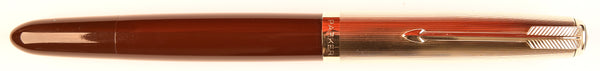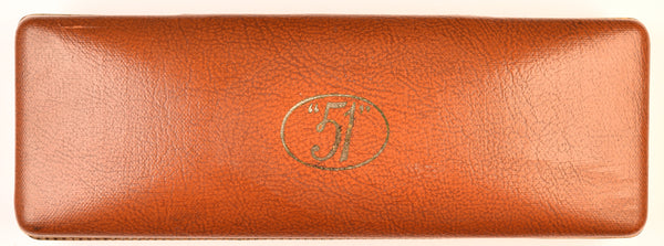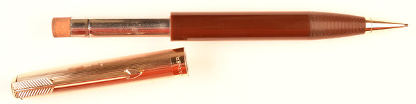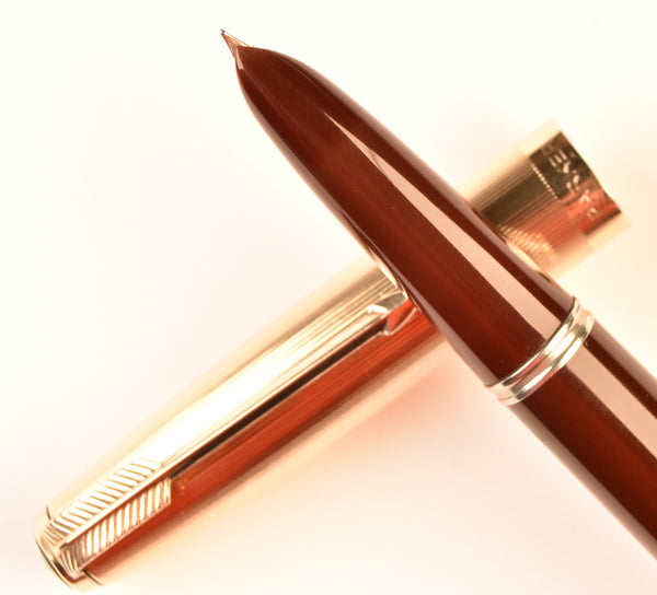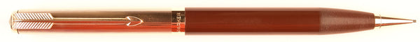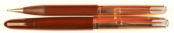 Produced in Canada, this is a Parker 51 Vacumatic pen and pencil set in cordovan brown with 1/10 14K gold filled caps with the tight parallel vertical line pattern. The pen is fitted with a fine 14k gold nib which produces a writing line of around 0.4mm
