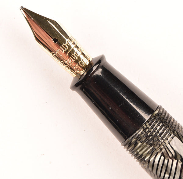 Dating from the early/mid 1950s, this is a Conway Stewart 24 fountain pen (13.0cms capped), with the matching #18 pencil, in silver candystripe with gold trim.