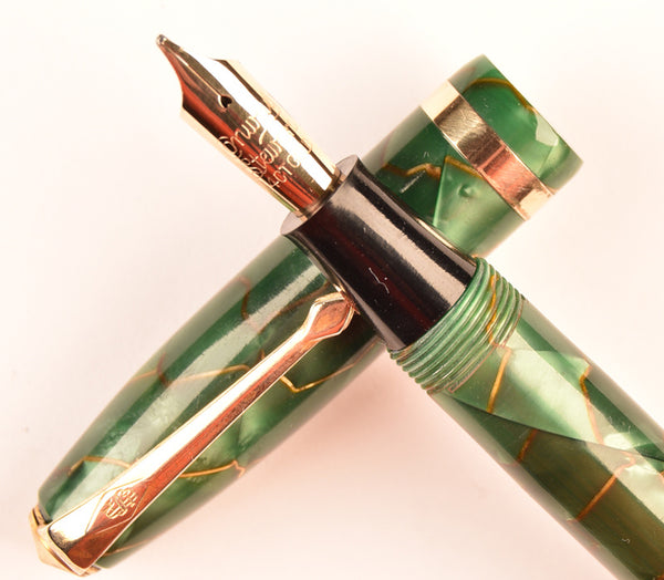 Dating from the early/mid 1950s, this is a mid sized pen (12cms capped) in gold veined green pearl marble with gold trim. This is fitted with 14k gold medium Conway #4 nib which produces a writing line of around 0.6mm
