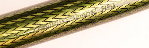 Dating from the early/mid 1950s, this is a largish pen (13.6cms capped) in green marble with black herringbone design and gold trim.