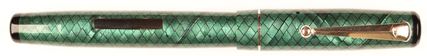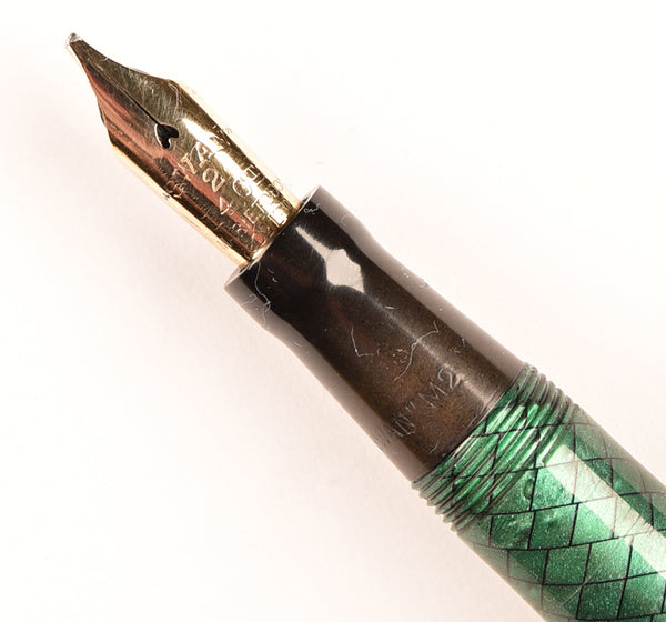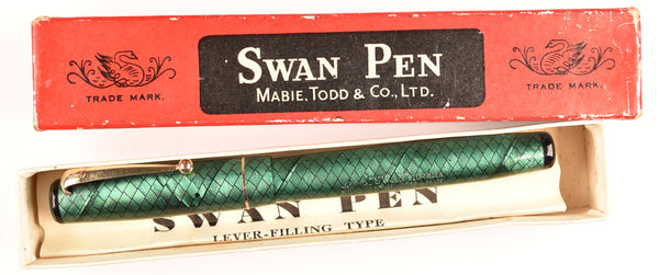 Dating from the late 1930s, this is a boxed Mabie Todd Swan #2 lever filler in green snakeskin with gold trim. The pen measures 12.5cms capped