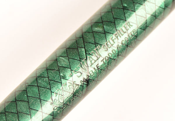The pen is all original and in excellent condition. The barrel imprints are quite crisp as shown in the photos. The pen's model number is imprinted around the end of the barrel as SM205/84 with the SM signifying Swan Minor; the 205 is the model series and the 84 is the company's code for the green snakeskin colour. Both the nib shell and the back of the feed are imprinted '"Swan" M2'