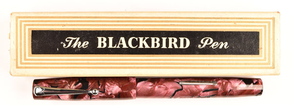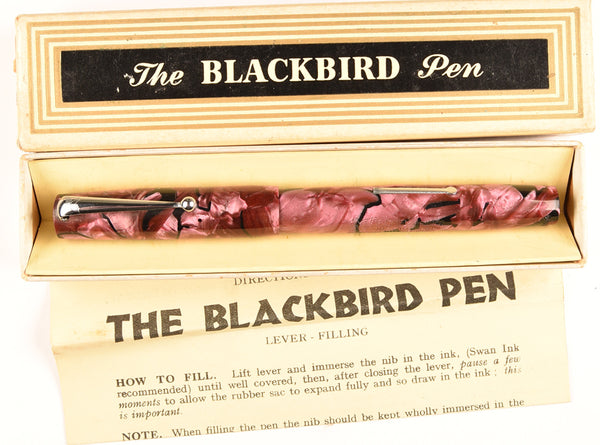Dating from the mid/late 1940s, this is Mabie Todd Blackbird 5244 in black veined lilac pearl marble with chrome trim