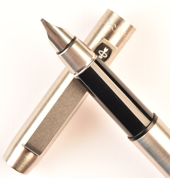 This example with black shell and trim has been lightly used, takes standard Parker cartridges and has increasingly hard to find italic steel nib which produces a writing line of between 0.4mm (fine) and 0.8mm (broad). This pen comes with a new Parker converter