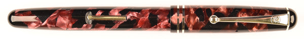 Dating from the late 1940s or early 50s, this De La Rue Pen is a mid sized pen (12.8cms capped) in light and dark burgundy pearl and black marble with gold trim
