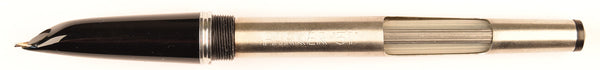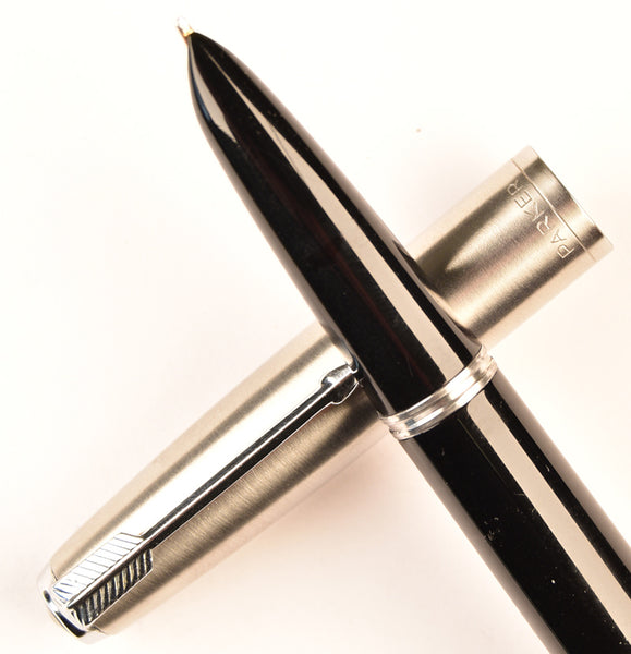 This is an English Parker 51 Classic with steel cap in black. This is fitted with a 14k gold stub nib which produces a vertical writing line of around 0.8mm (broad) contrasting with a horizontal line of around 0.4 (fine)