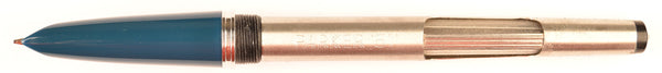 This is an English Parker 51 Mk1 Custom in teal blue with a rolled gold cap. It's fitted with a medium 14k gold nib which produces a writing line of around 0.6mm