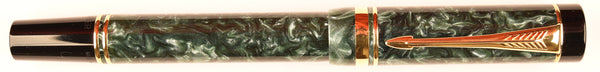 This is an early Duofold International fountain pen in green marble with gold trim and dates from the early 1990s after Parker's minor redesign of the Duofold which introduced a slightly longer and thicker clip with raised rather than imprinted feathers and also raised rather than flat cap rings.